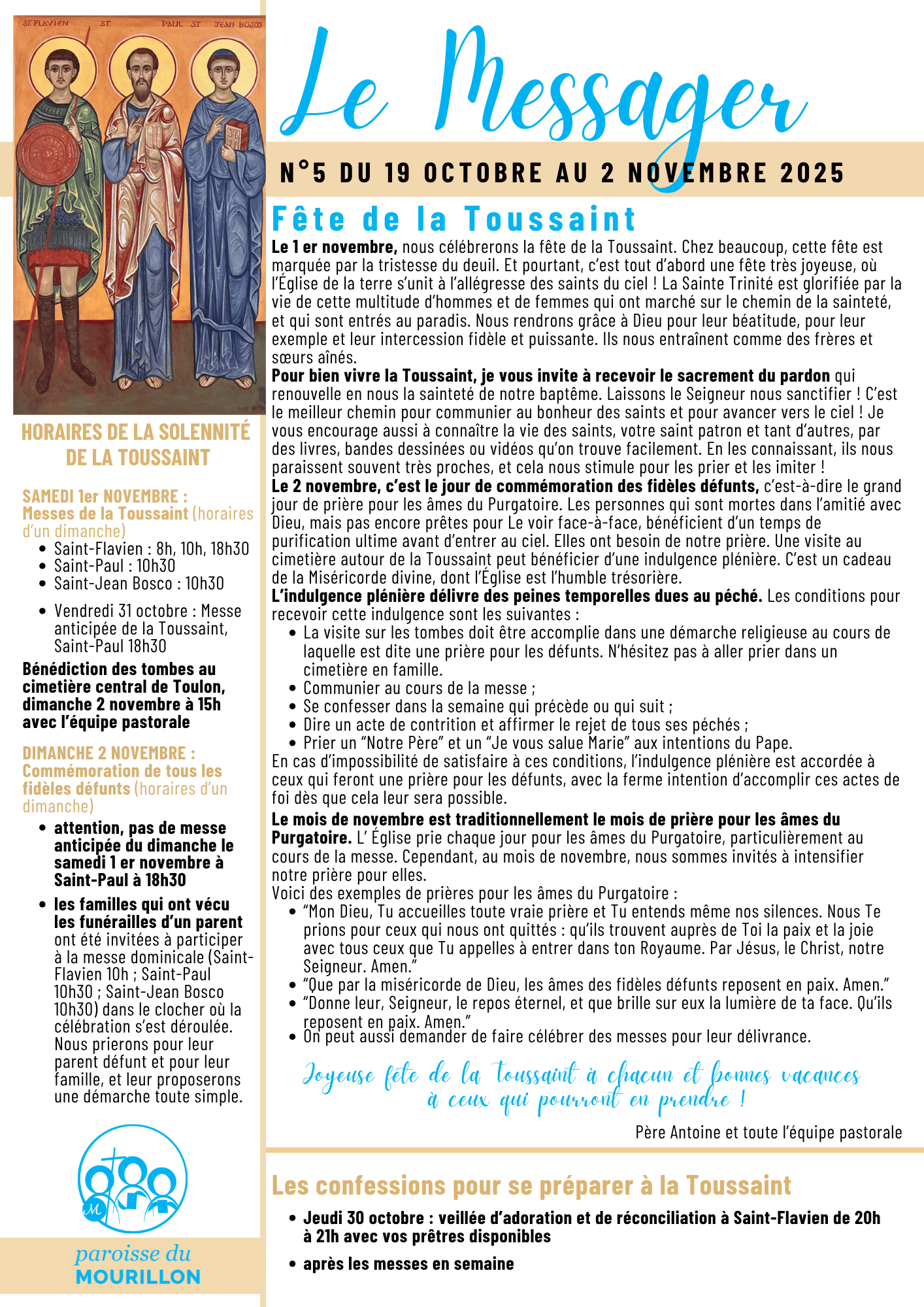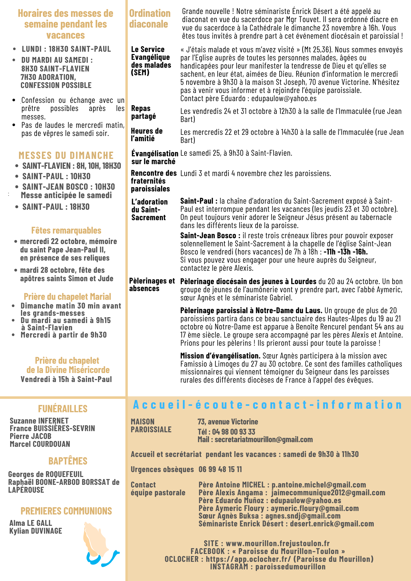 Vous trouverez toutes les informations de la paroisse pour la quinzaine, notamment les horaires des messes du week-end de la Toussaint, bénédiction des tombes et l’ordination diaconale d’Enrick !