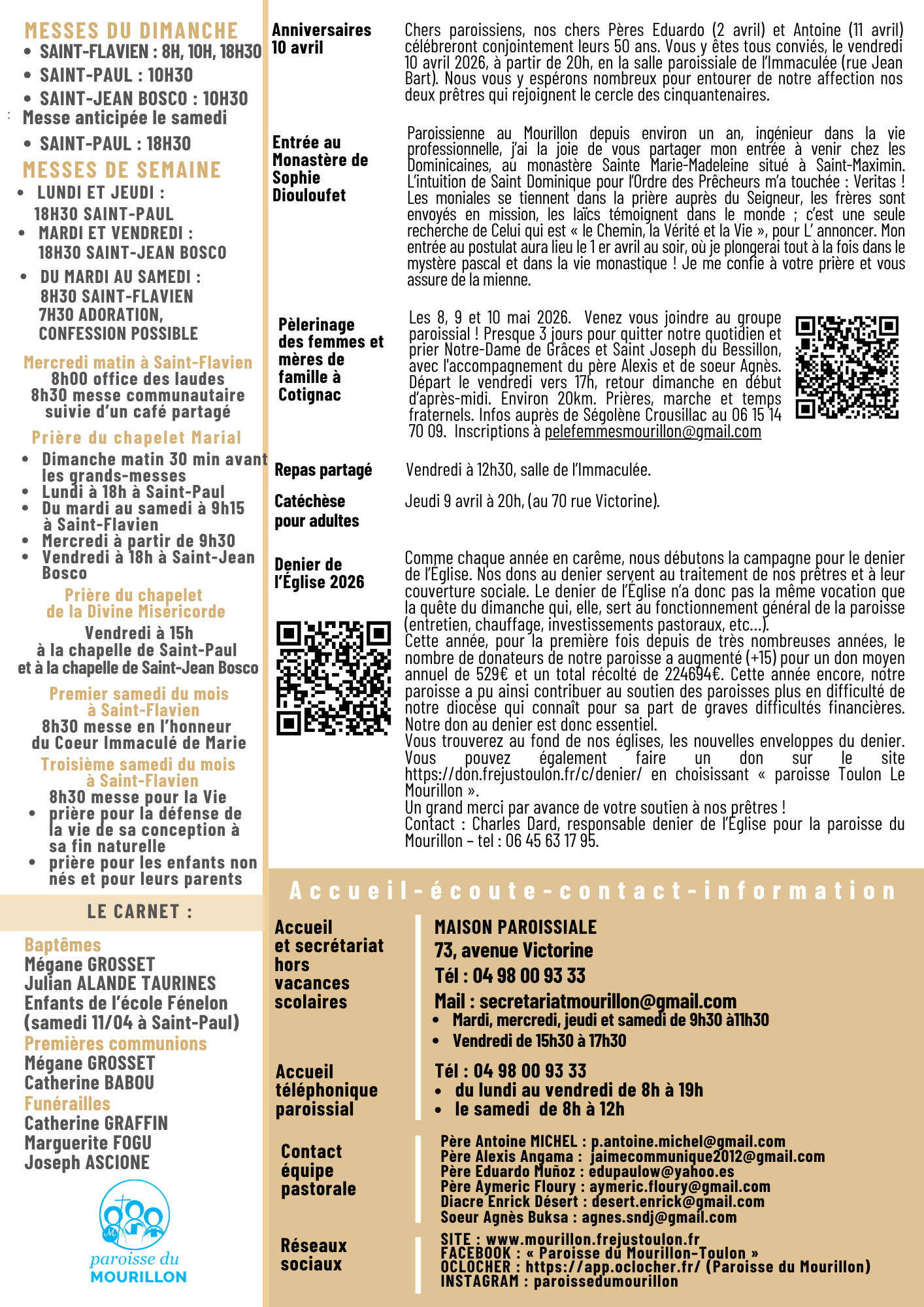 Vous trouverez toutes les informations relatives à la paroisse pour la quinzaine, notamment les horaires de la semaine Sainte et des célébrations de Pâques et tout ce qu’il faut savoir sur le Denier de l’Église !
